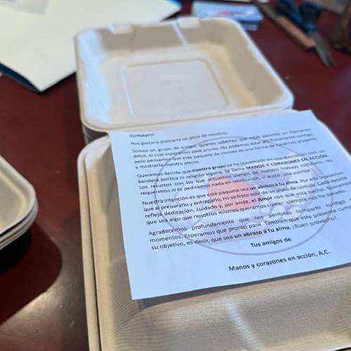 Nuestra visión deriva de apreciar que existen personas quienes están pasando un momento difícil. Somos conscientes de que no podemos estar ahí, físicamente, pero consideramos que una forma de contacto es una muestra de afecto y que, con ella, de alguna nos hacemos presentes. Para ello, entregamos un paquete de comida, en el que tratamos de cuidar hasta el último detalle, buscamos que contenga un platillo principal, una pasta y una ensalada. Además, de un bote de agua y, por lo general un postre. Actualmente, comenzamos a llevar café, y acompañamos con azúcar, mascabado, endulzante y/o crema, así como una galleta o pan con que acompañarlo. También procuramos utilizar elementos que sean lo menos contaminantes posibles.